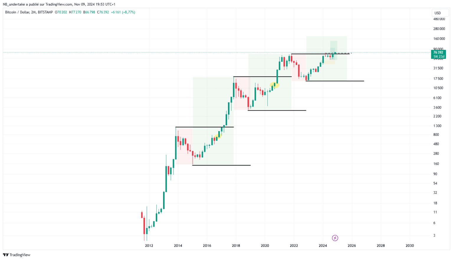 Point bas de janvier 2023 : Le mois de janvier 2023 représente le bas du marché avant que Bitcoin ne commence à se préparer pour son prochain cycle haussier. Ce point est crucial car il marque la fin de la correction qui a suivi le précédent marché haussier. Les analystes identifient souvent un « point bas » comme une opportunité de commencer à accumuler des positions avant la reprise du marché.