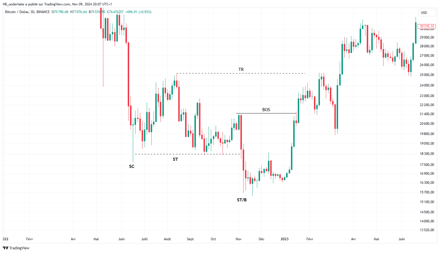 Nous avons eu en janvier 2023 le point bas pour le prochain cycle haussier de 2024/2025. Il est donc très intéressant d’analyser ce point bas et on peut voir une magnifique accumulation avec le SC, l’AR qui vient créer la trading range, la création de liquidité (ST), le ST/B qui vient récupérer toute la liquidité, et à partir du BOS, nous avons eu la confirmation de l’accumulation..